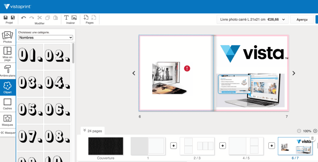 Vistaprint est devenu Vista, rassemblant désormais ses différents services sous un même nom et intégrant des plateformes comme Depositphotos, Crello (devenu VistaCreate) et 99designs. Le site cible avant tout la création digitale pour les entreprises, mais l’offre d’albums photo pour particuliers reste accessible, bien que nichée dans le menu « Cadeaux photo ». Vista propose l’un des plus grands choix de tailles d’albums (8 formats) et permet de travailler en ligne ou via un éditeur téléchargeable, sans inscription préalable. L’éditeur, riche en options, peut paraître complexe au début, mais offre une grande liberté créative après quelques essais. Vista propose aussi la création de calendriers, affiches, invitations, objets, vêtements ou même de sites web.